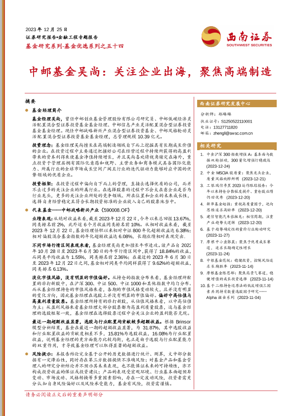 【西南证券】【20231225】基金优选系列之五十四:中邮基金吴尚:关注企业出海,聚焦高端制造-24页