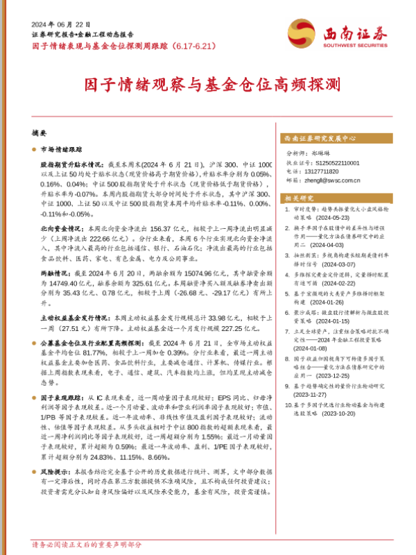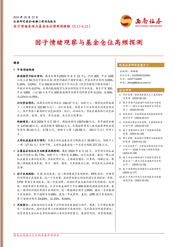 【西南证券】【20240622】因子情绪表现与基金仓位探测跟踪:因子情绪观察与基金仓位高频探测-16页