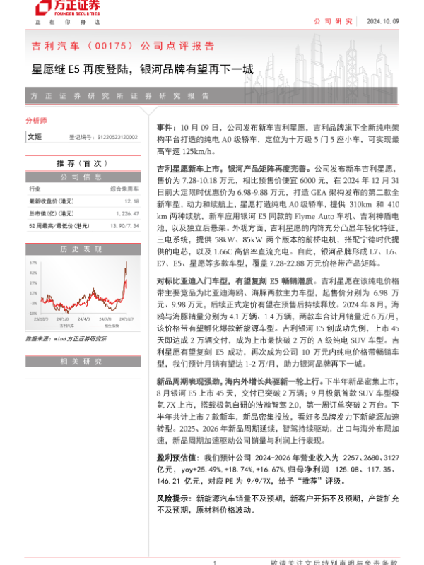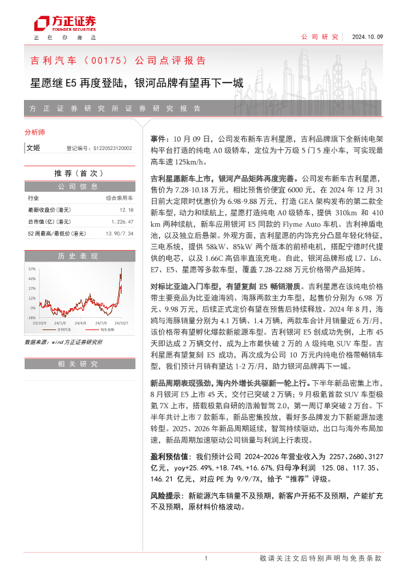 【方正证券】【20241009】吉利汽车(0175.HK)公司点评报告:星愿继E5再度登陆,银河品牌有望再下一城-10页
