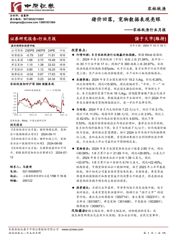【中原证券】【20241016】农林牧渔行业月报:猪价回落,宠物数据表现亮眼-15页