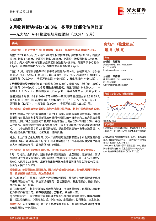【光大证券】【20241015】地产行业光大地产A+H物业板块月度跟踪(2024年9月)-10页