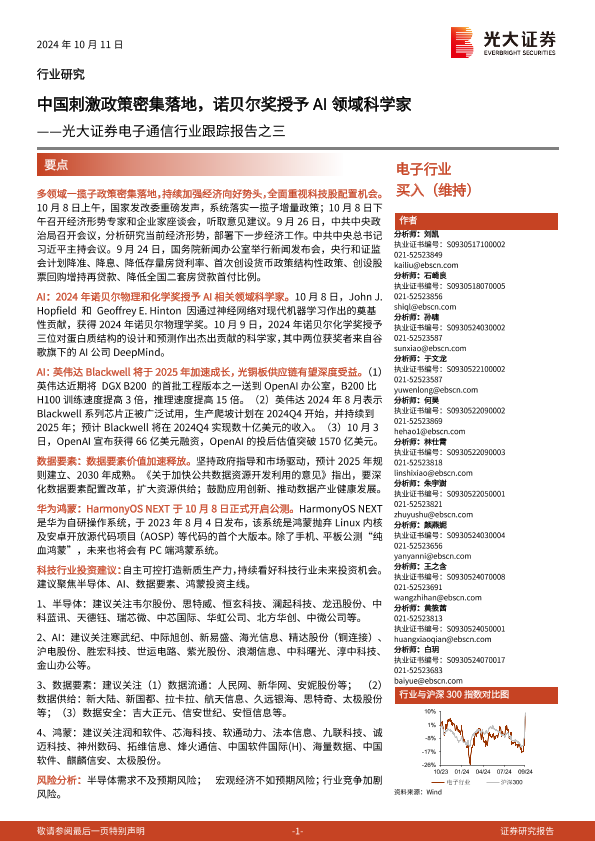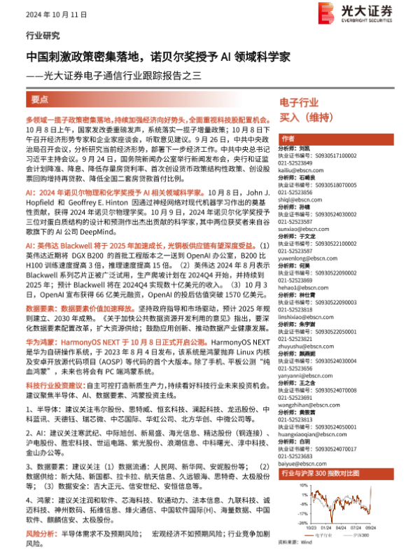 【光大证券】【20241011】电子通信行业跟踪报告之三:中国刺激政策密集落地,诺贝尔奖授予AI领域科学家-24页