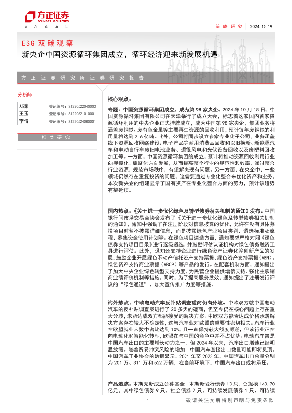 【方正证券】【20241019】ESG双碳观察:新央企中国资源循环集团成立,循环经济迎来新发展机遇-17页