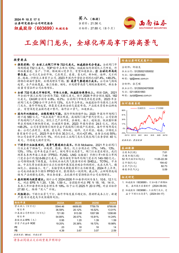 【西南证券】【20241017】纽威股份(603699)工业阀门龙头,全球化布局享下游高景气-43页