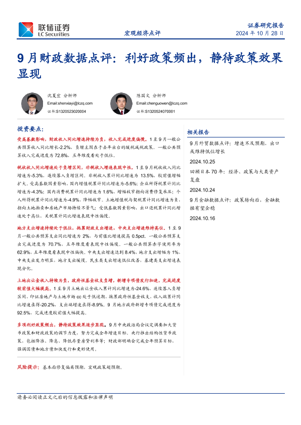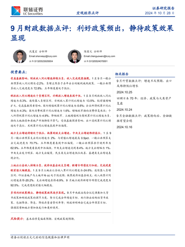 【联储证券】【20241028】9月财政数据点评:利好政策频出,静待政策效果显现-14页