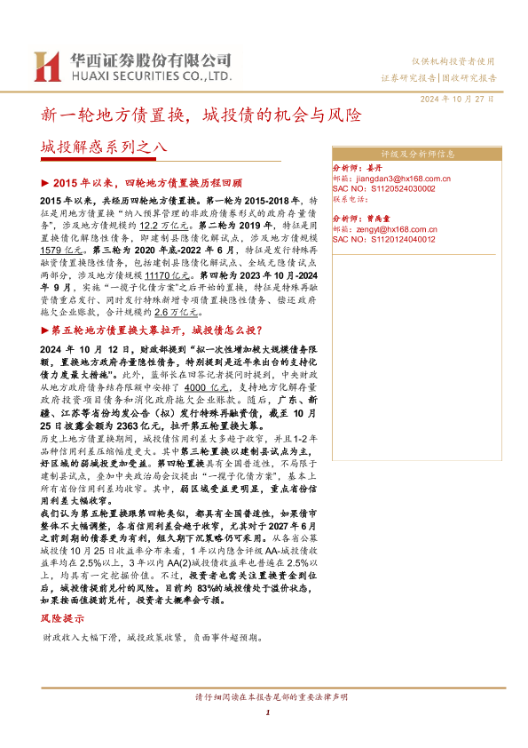 【华西证券】【20241027】城投解惑系列之八:新一轮地方债置换,城投债的机会与风险-16页