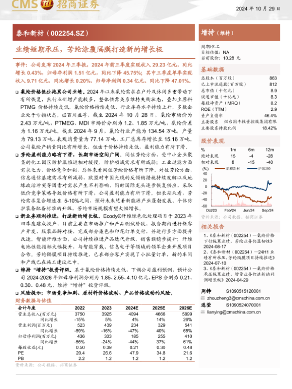 【海通证券】【20241029】泰和新材(002254)业绩短期承压,芳纶涂覆隔膜打造新的增长极-15页
