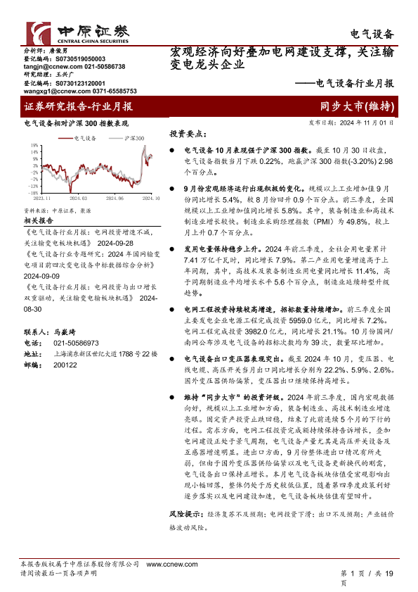 【中原证券】【20241101】电气设备行业月报:宏观经济向好叠加电网建设支撑,关注输变电龙头企业-19页