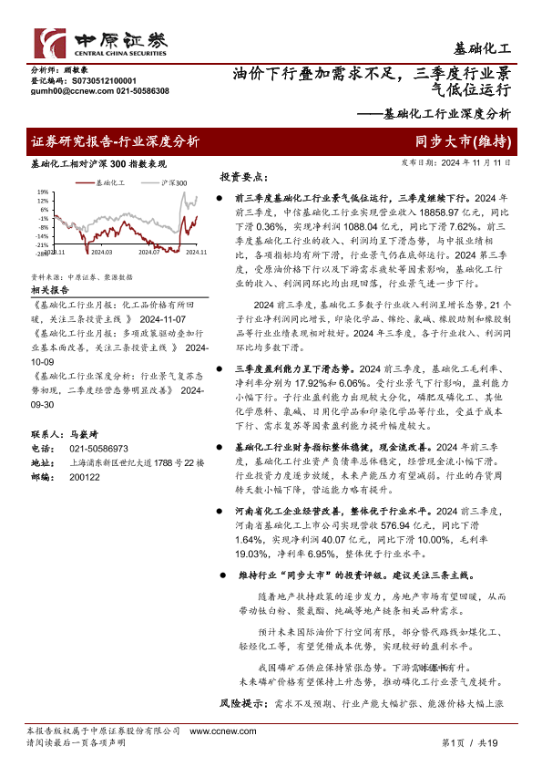 【中原证券】【20241111】基础化工行业深度分析:油价下行叠加需求不足,三季度行业景气低位运行-19页