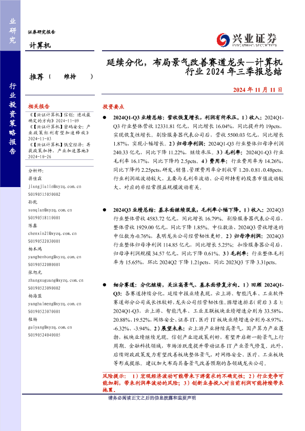 【兴业证券】【20241111】计算机行业2024年三季报总结:延续分化,布局景气改善赛道龙头-18页