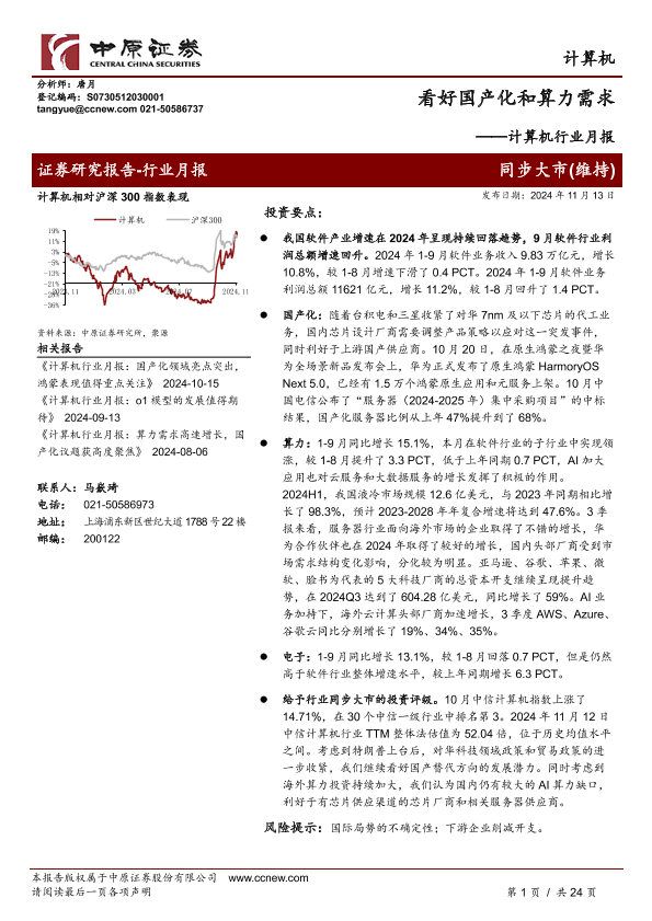 【中原证券】【20241113】计算机行业月报:看好国产化和算力需求-24页
