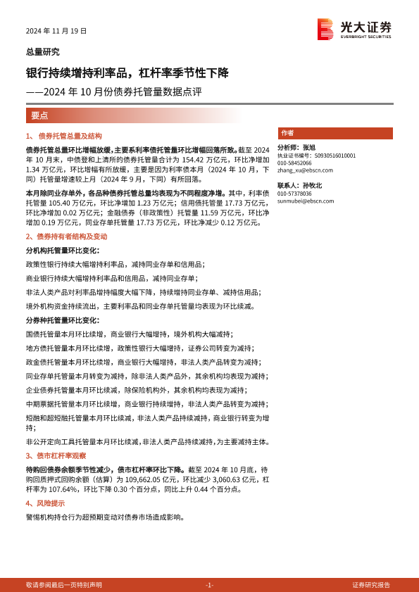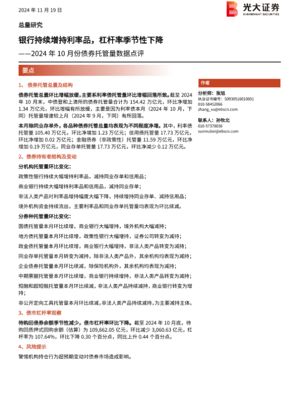 【光大证券】【20241119】2024年10月份债券托管量数据点评:银行持续增持利率品,杠杆率季节性下降-11页