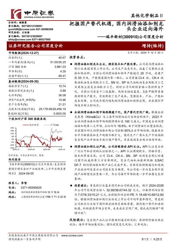 【中原证券】【20241230】瑞丰新材(300910)公司深度分析:把握国产替代机遇,国内润滑油添加剂龙头企业迈向海外-25页
