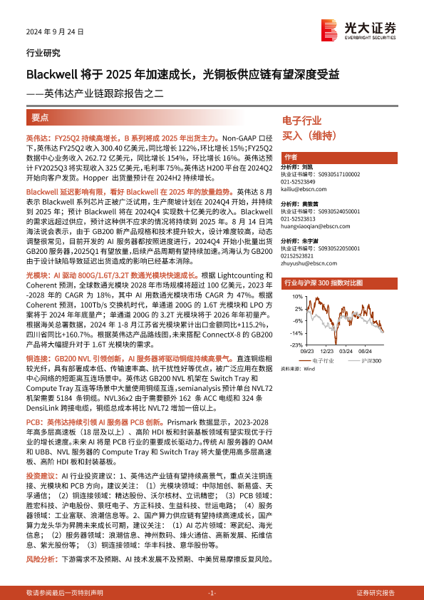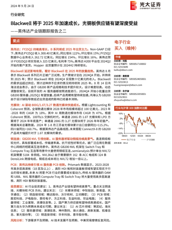 【光大证券】【20240924】电子行业英伟达产业链跟踪报告之二:Blackwell将于2025年加速成长,光铜板供应链有望深度受益-34页