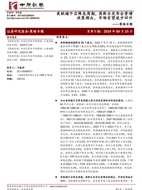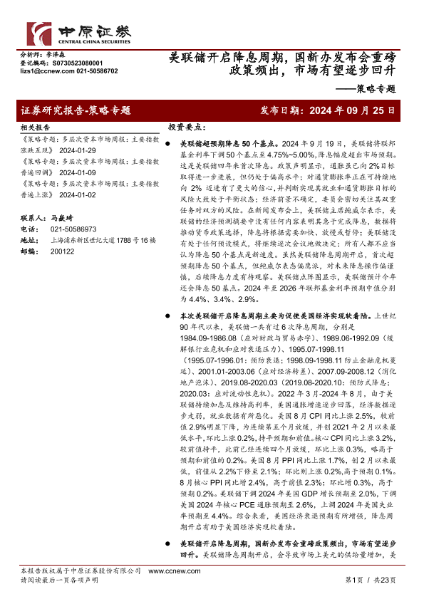 【中原证券】【20240925】策略专题:美联储开启降息周期,国新办发布会重磅政策频出,市场有望逐步回升-23页