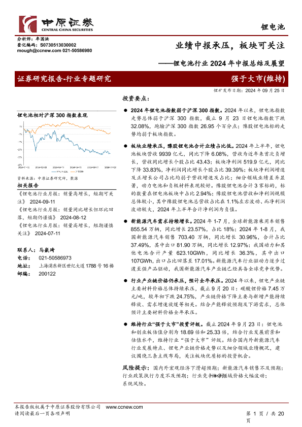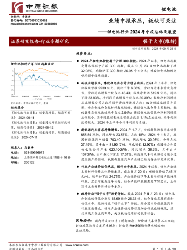 【中原证券】【20240925】锂电池行业2024年中报总结及展望:业绩中报承压,板块可关注-20页