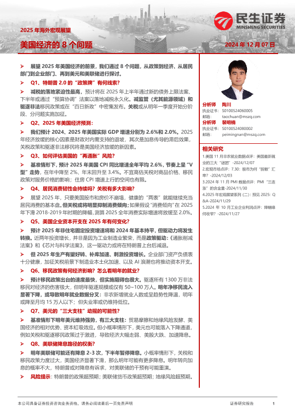 【民生证券】【20241207】2025年海外宏观展望:美国经济的8个问题-19页