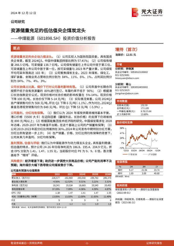 【光大证券】【20241212】中煤能源(601898)投资价值分析报告:资源储量充足的低估值央企煤炭龙头-22页