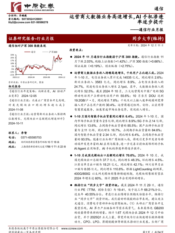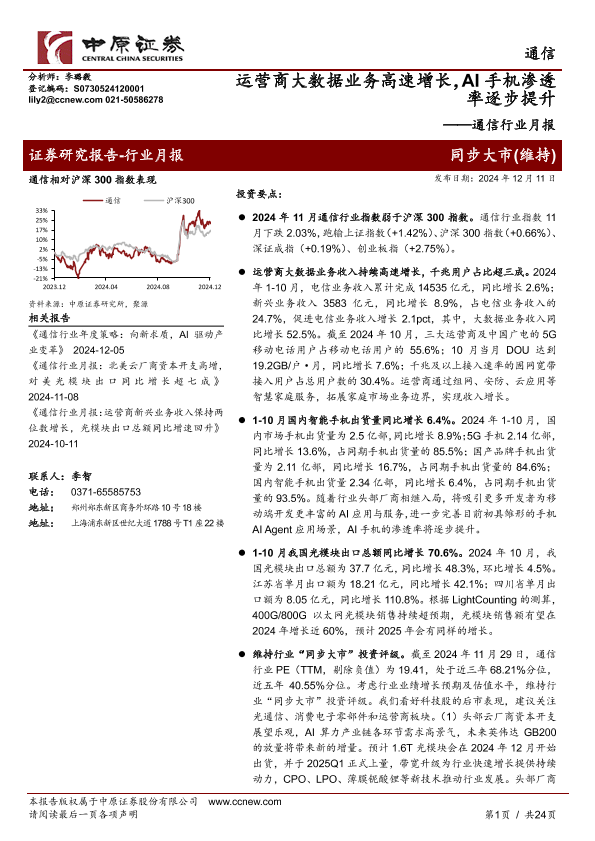 【中原证券】【20241211】通信行业月报:运营商大数据业务高速增长,AI手机渗透率逐步提升-24页