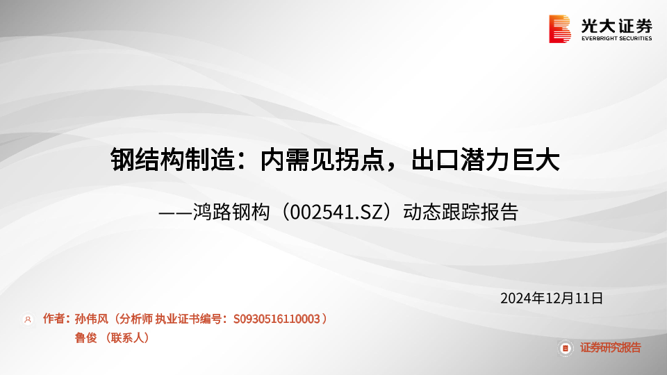 【光大证券】【20241211】鸿路钢构(002541)动态跟踪报告:钢结构制造,内需见拐点,出口潜力巨大-16页