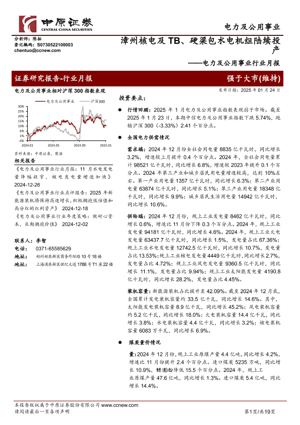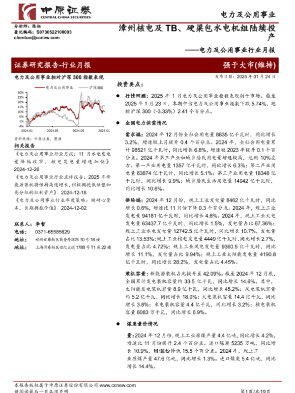 【中原证券】【20250124】电力及公用事业行业月报:漳州核电及TB、硬梁包水电机组陆续投产-19页