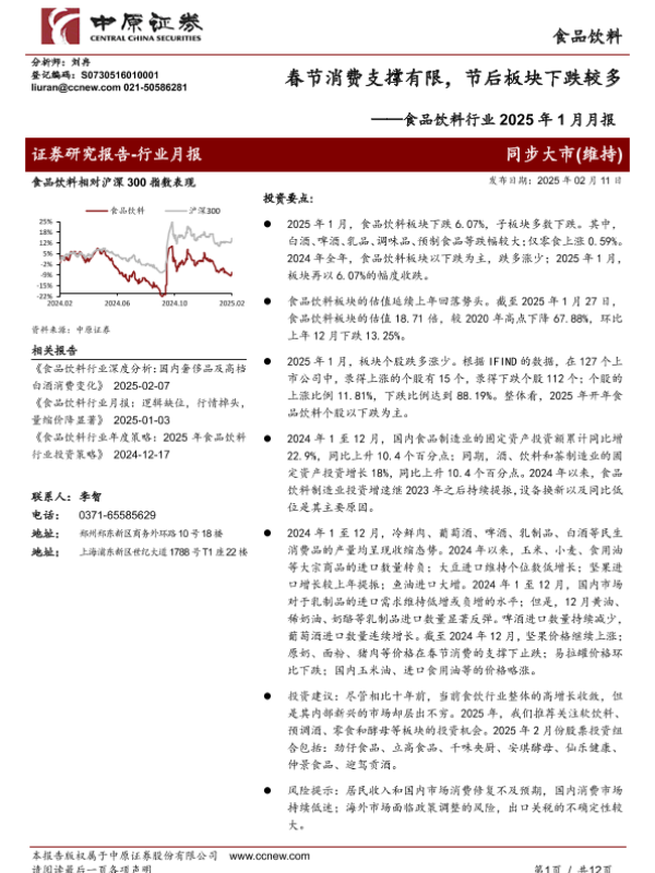 【中原证券】【20250211】食品饮料行业2025年1月月报:春节消费支撑有限,节后板块下跌较多-12页