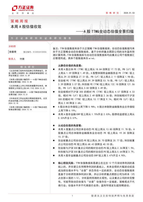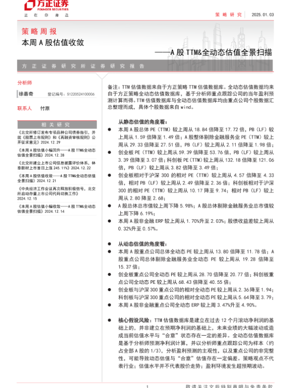 【方正证券】【20250103】A股TTM&全动态估值全景扫描:本周A股估值收敛-15页