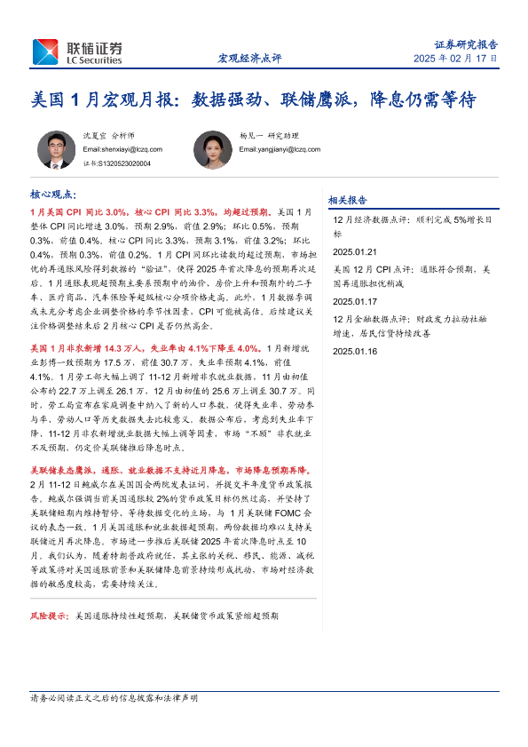 【联储证券】【202502】美国1月宏观月报:数据强劲、联储鹰派,降息仍需等待-14页