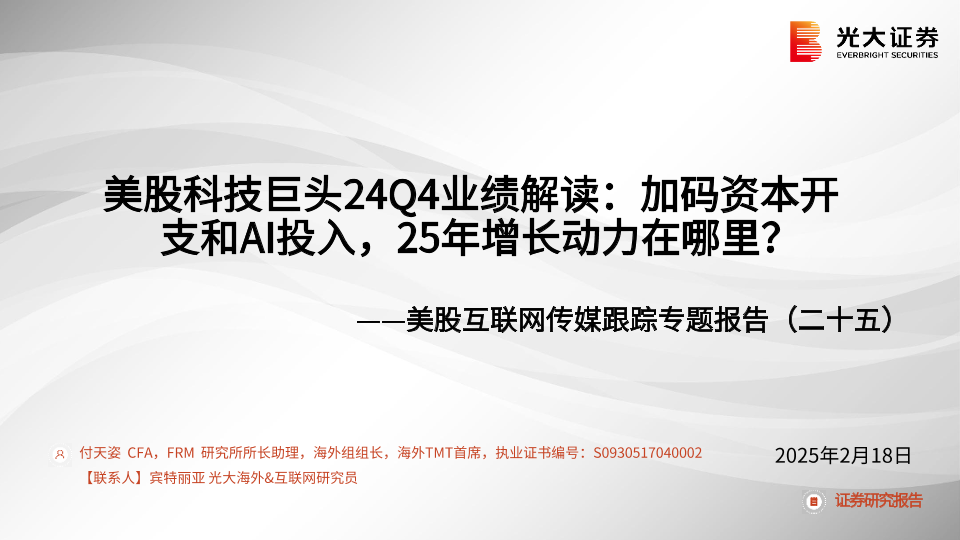 【光大证券】【20250218】美股互联网传媒行业跟踪专题报告(二十五):美股科技巨头24Q4业绩解读,加码资本开支和AI投入,25年增长动力在哪里?-28页