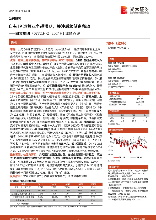 【光大证券】【20240813】2024H1业绩点评:自有IP运营业务超预期,关注后续储备释放-3页
