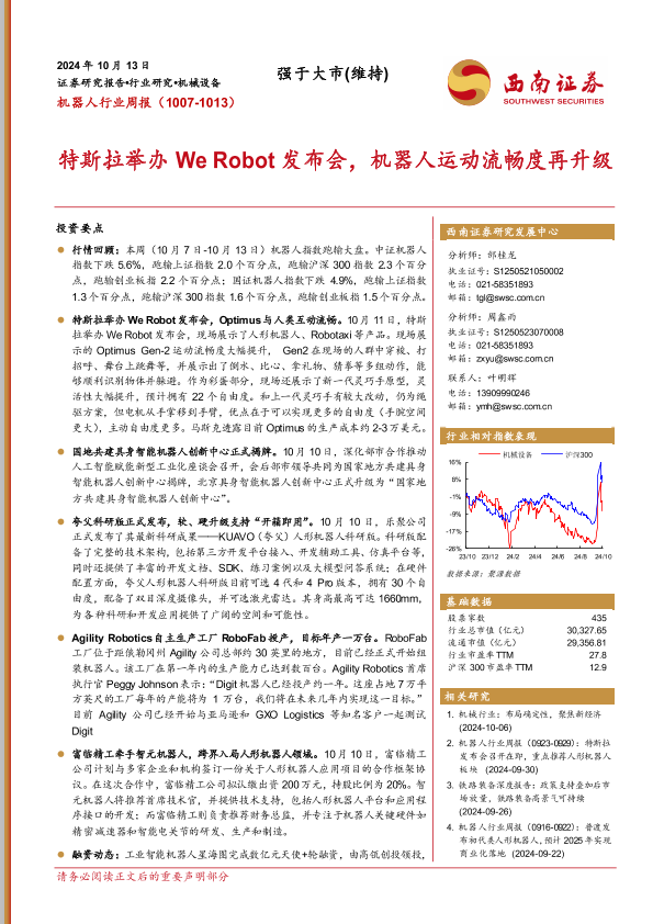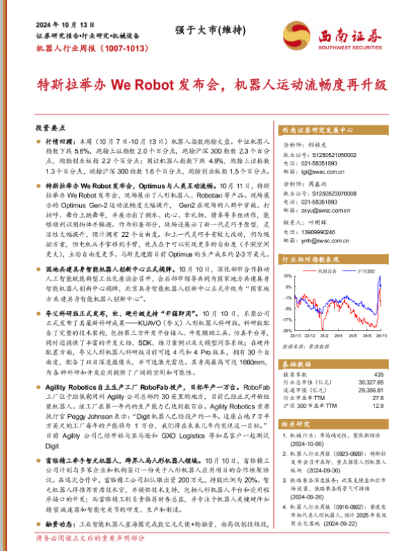 【西南证券】【20241013】20241017-机器人行业周报:特斯拉举办We Robot发布会,机器人运动流畅度再升级-13页