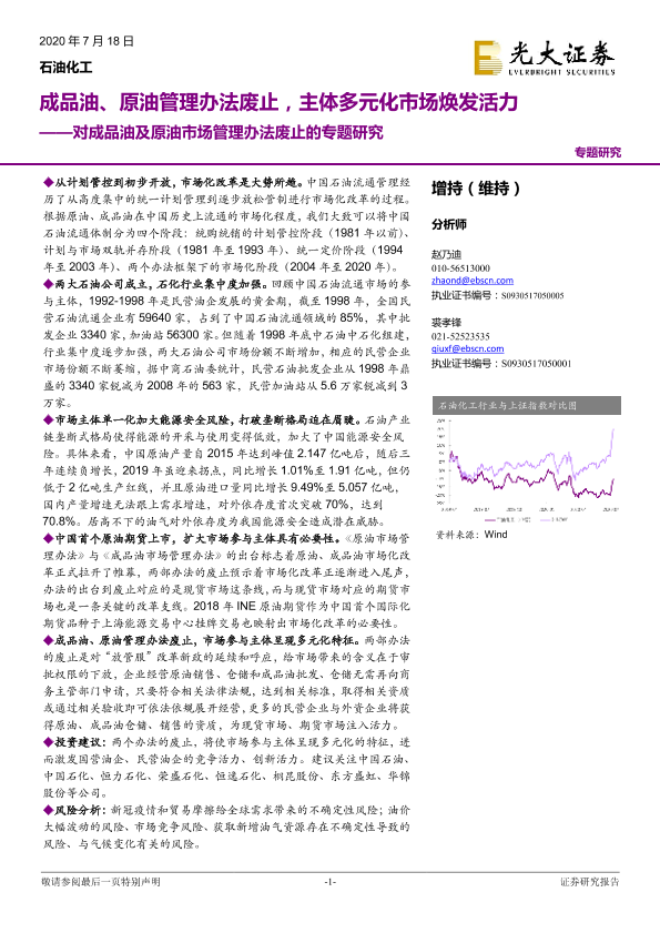 【光大证券】【20200718】对成品油及原油市场管理办法废止的专题研究:成品油、原油管理办法废止,主体多元化市场焕发活力-26页
