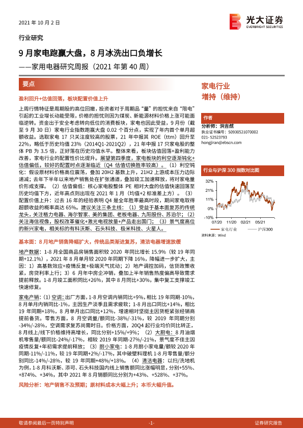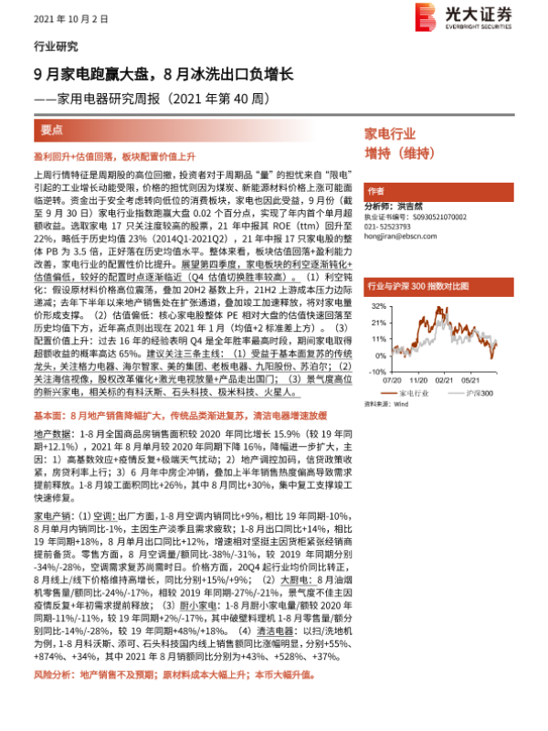 【光大证券】【20211002】家用电器研究周报(2021年第40周):9月家电跑赢大盘,8月冰洗出口负增长-27页