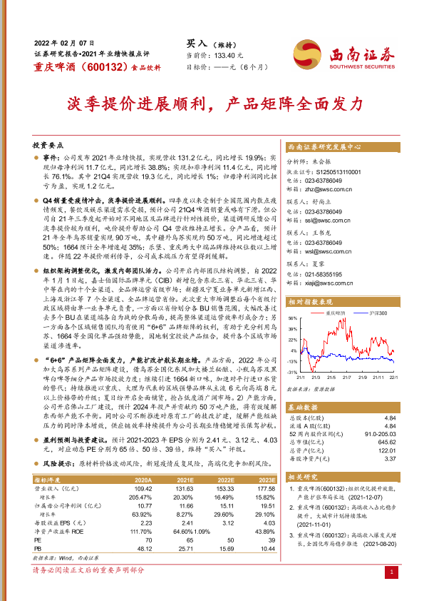 【西南证券】【20220207】20220207-西南证券-重庆啤酒-600132.SH-淡季提价进展顺利_产品矩阵全面发力-4页
