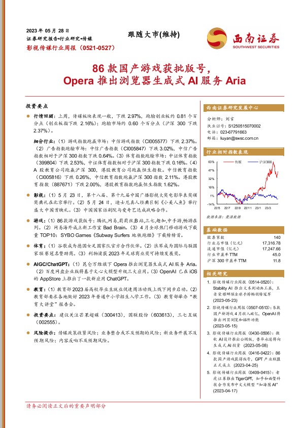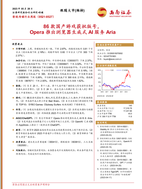 【西南证券】【20230528】20230528-西南证券-影视传媒行业周报_86款国产游戏获批版号_Opera推出浏览器生成式AI服务Aria-19页