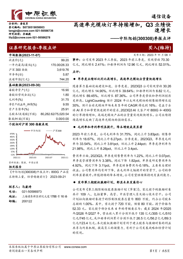 【中原证券】【20231108】高速率光模块订单持续增加_Q3业绩快速增长-5页