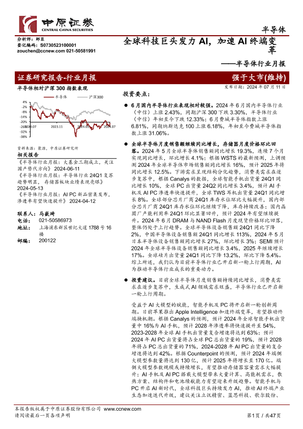 【中原证券】【20241007】2024年10月07日更新-【中原证券】半导体行业月报:全球科技巨头发力AI,加速AI终端变革-47页
