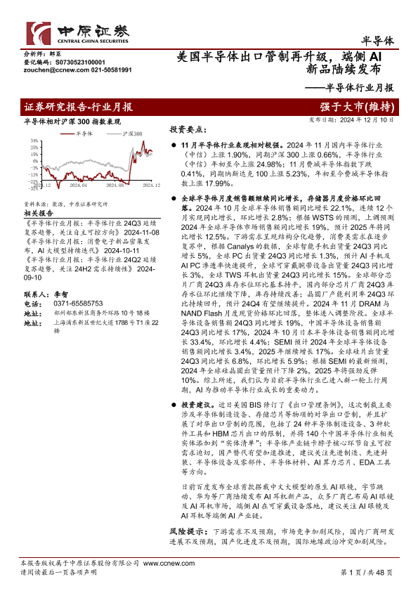 【中原证券】【20241210】2024年12月13日更新-【中原证券】半导体行业月报:美国半导体出口管制再升级,端侧AI新品陆续发布-48页