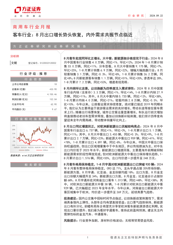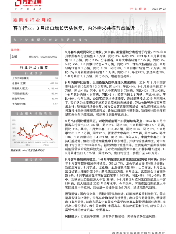 【方正证券】【20241011】2024年10月11日更新-【方正证券】商用车行业月报-客车行业:8月出口增长势头恢复,内外需求共振节点临近-16页