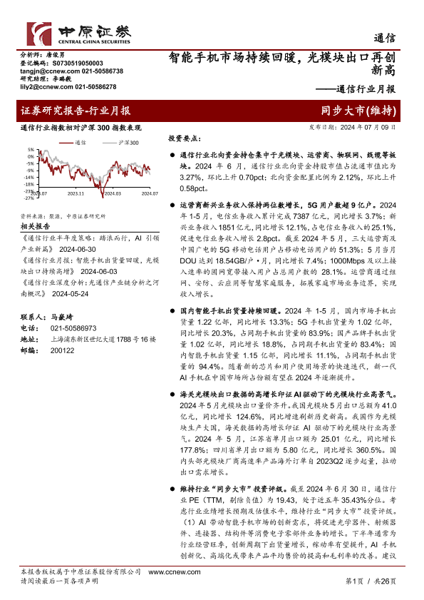 【中原证券】【20241018】2024年10月18日更新-【中原证券】通信行业月报:智能手机市场持续回暖,光模块出口再创新高-26页