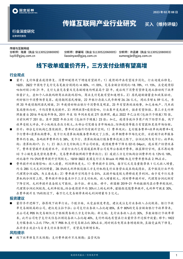 【国金证券】【20230209】2023-02-09-传媒互联网产业行业研究-线下收单或量价齐升-三方支付业绩有望高增-19页