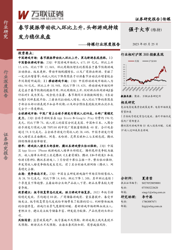 【万联证券】【20230525】2023-05-26-传媒行业深度报告-春节提振带动收入环比上升-头部游戏持续发力稳住底盘-17页