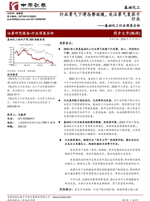 【中原证券】【20231114】基础化工行业深度分析 行业景气下滑态势放缓-关注景气复苏子行业-17页