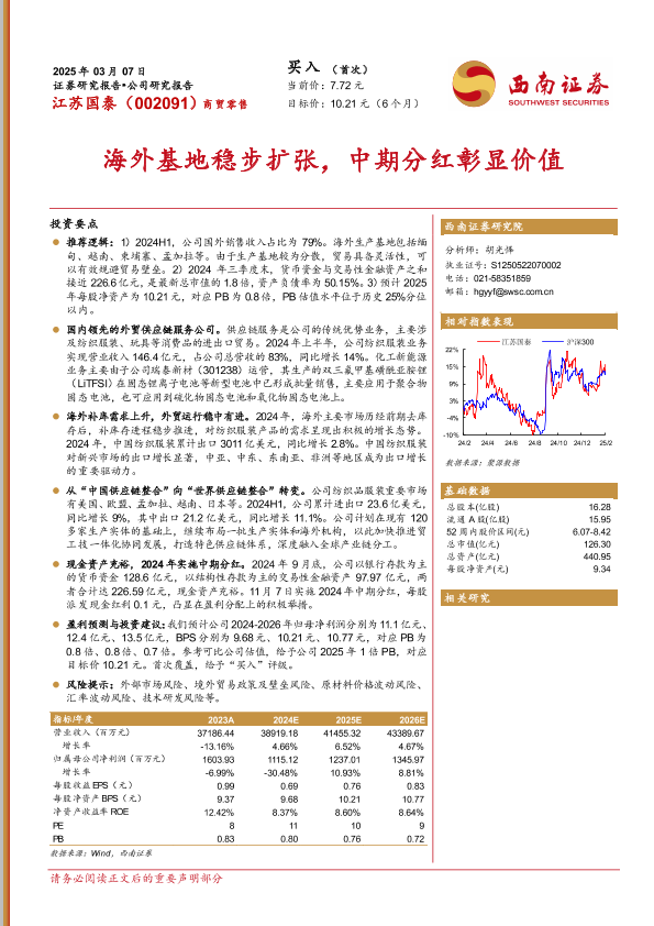 化工新能源 中期分红 江苏国泰 供应链服务 海外扩张