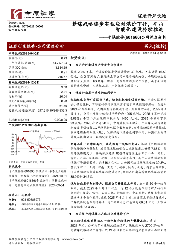 【中原证券】【20250403】20250403-中原证券-平煤股份-601666.SH-公司深度分析:精煤战略稳步实施应对煤价下行,矿山智能化建设持续推进-24页