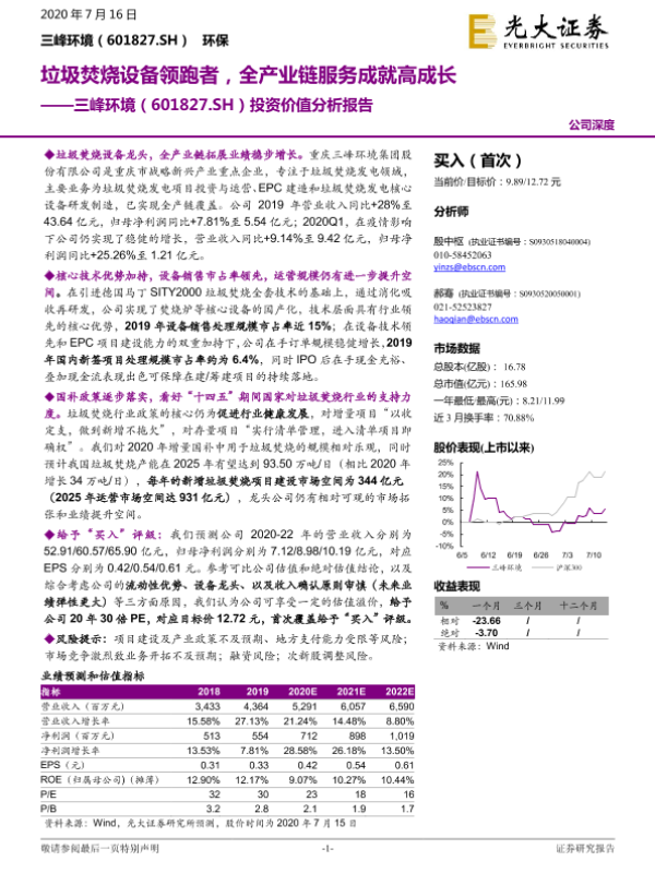 【光大证券】【20200716】20200716-光大证券-三峰环境-601827.SH-投资价值分析报告:垃圾焚烧设备领跑者,全产业链服务成就高成长-24页