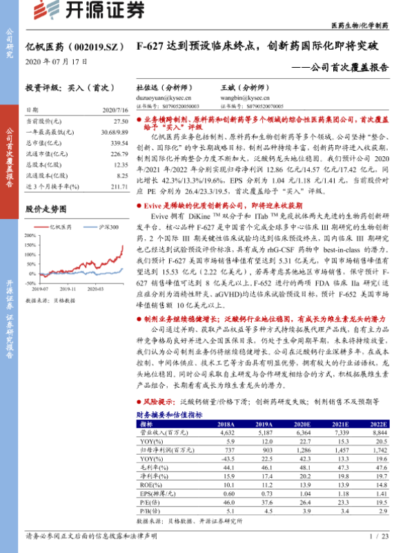 【开源证券】【20200717】20200717-开源证券-亿帆医药-002019.SZ-公司首次覆盖报告:F-627达到预设临床终点,创新药国际化即将突破-23页