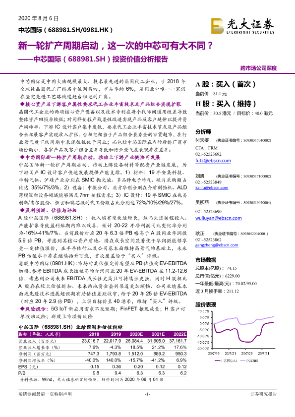 【光大证券】【20200806】20200806-光大证券-中芯国际-688981.SH-投资价值分析报告:新一轮扩产周期启动,这一次的中芯可有大不同?-30页