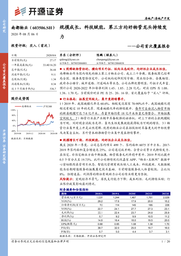 【开源证券】【20200806】20200806-开源证券-南都物业-603506.SH-公司首次覆盖报告:规模成长,科技赋能,第三方均好物管龙头持续发力-20页