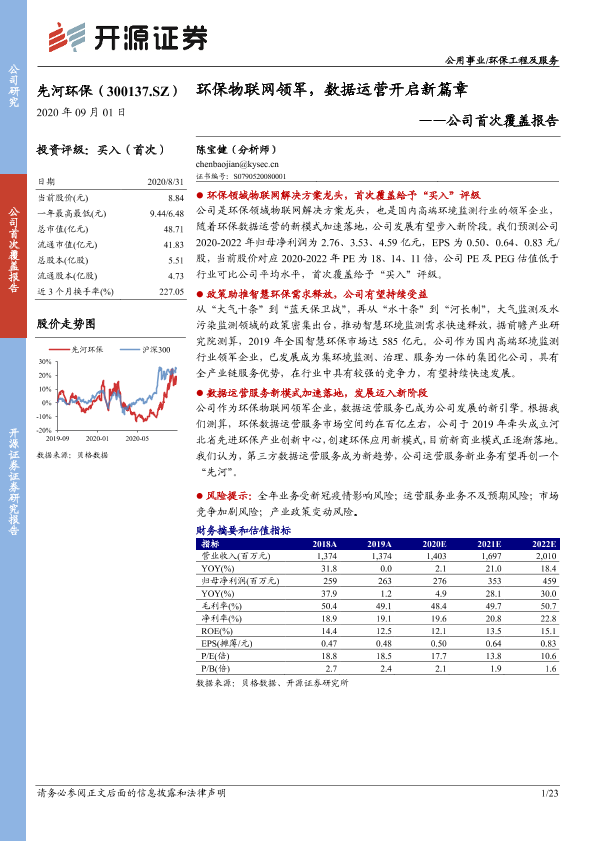 【开源证券】【20200901】20200901-开源证券-先河环保-300137.SZ-公司首次覆盖报告:环保物联网领军,数据运营开启新篇章-23页